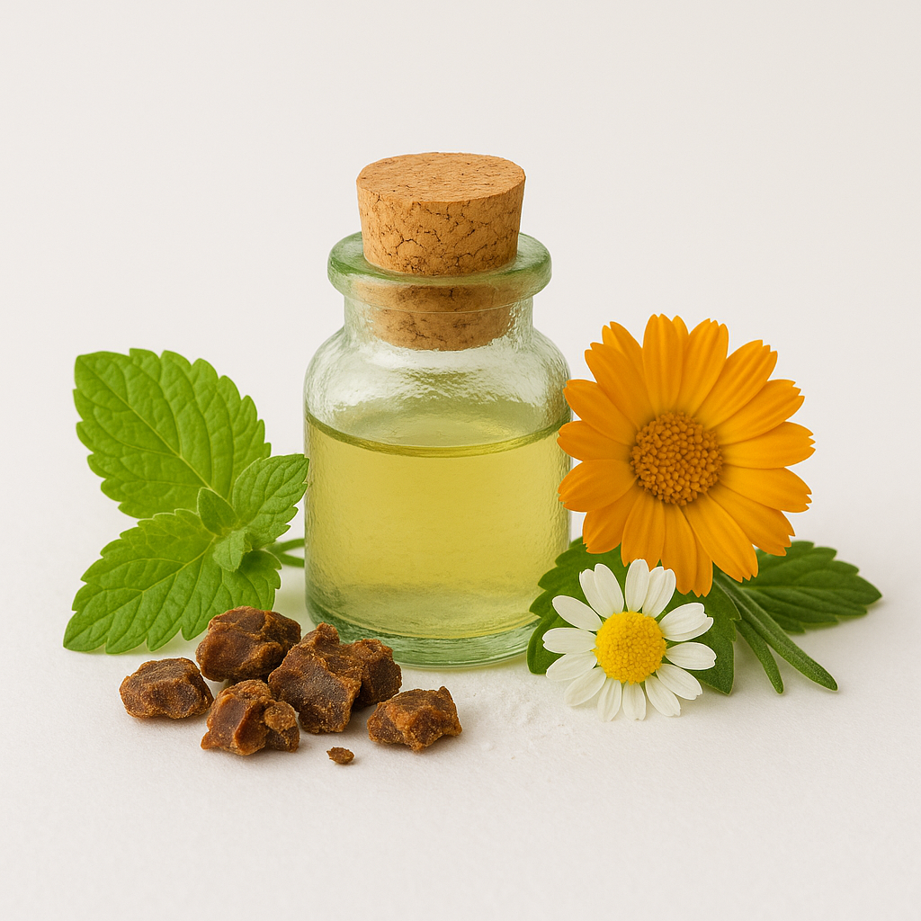 Extracto glicérico de propóleos, caléndula, manzanilla, melisa, ácido ascórbico.